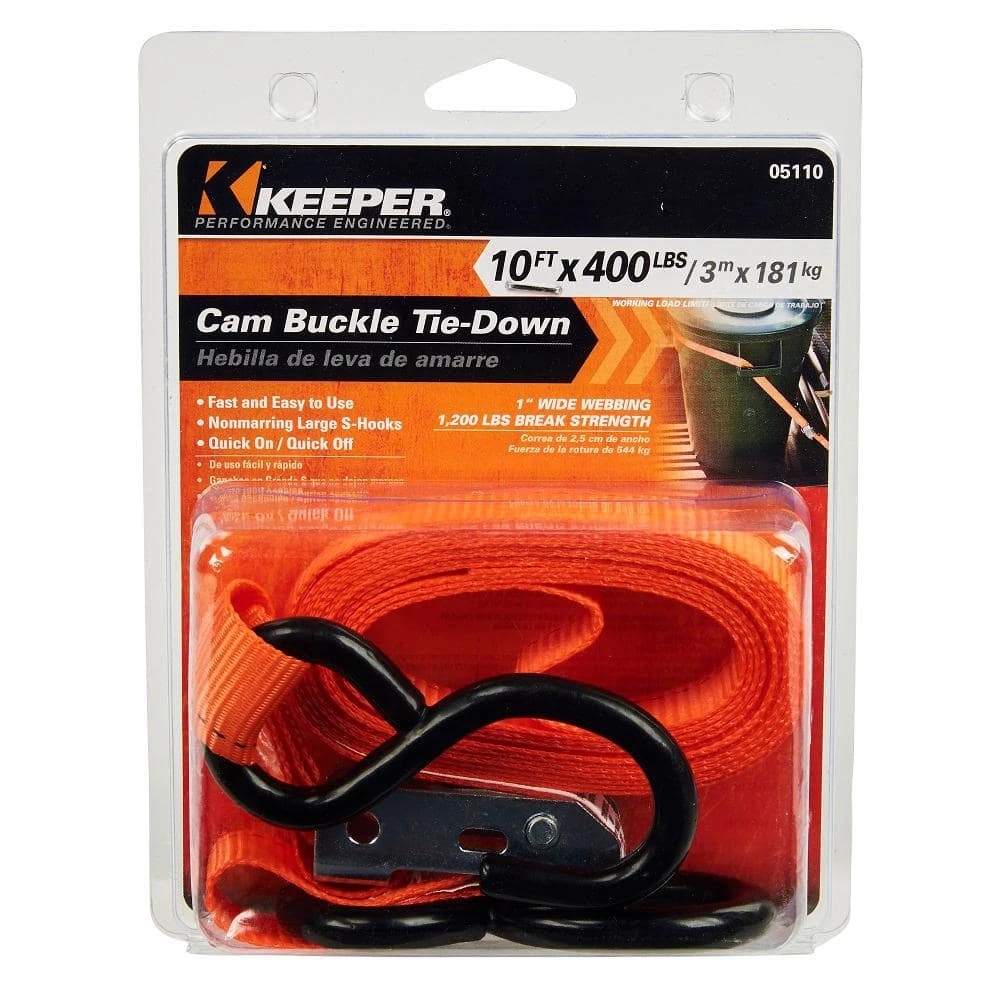 Keeper’s 1 in. x 10 ft. x 400 lbs. Cam Buckle Tie down is a fast, easy to use cam buckle with a quick release thumb button. Recommended for pickup trucks and utility trailers, the cam buckle’s teeth grip the Hi-Test webbing with a security you can trust. Webbing is UV and weather resistant.