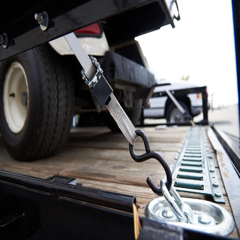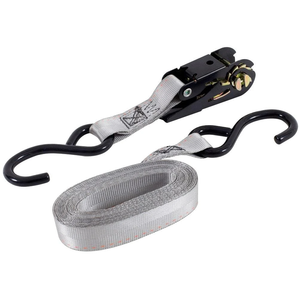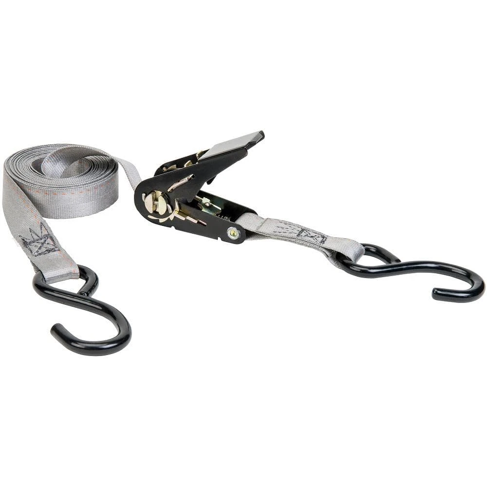 The Keeper 14 ft. High Tension Ratchet Tie-Down features a durable 1 in. Hi-Test webbing to absorb shock and is corrosion and abrasion-resistant. It is constructed with a metal ratchet and handle, and vinyl-coated S hooks. The ratchet buckle is designed with a rotating gear and lever mechanism latch to tighten and secure your load. To engage attach the hook to an anchor point, pull webbing over cargo load and tug to desired tension. Ratchet by raising and lowering the handle. The webbing then locks cargo into place.