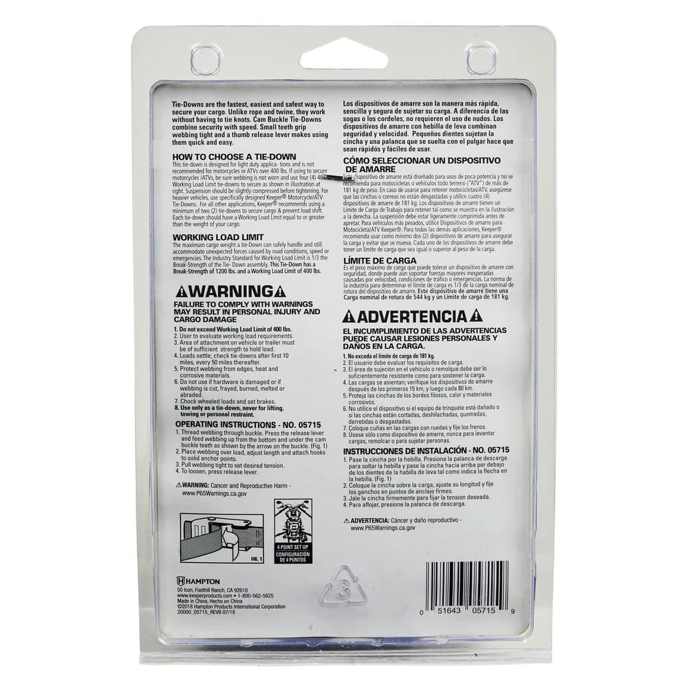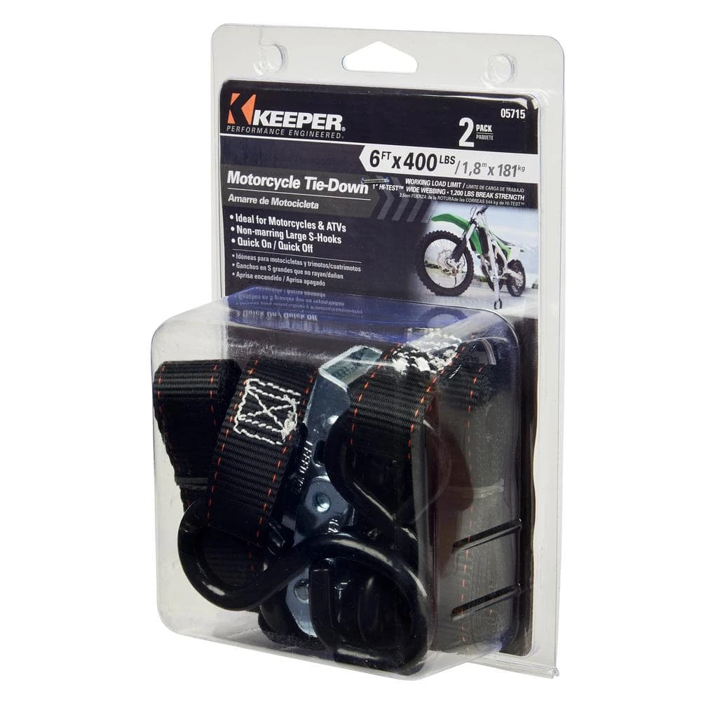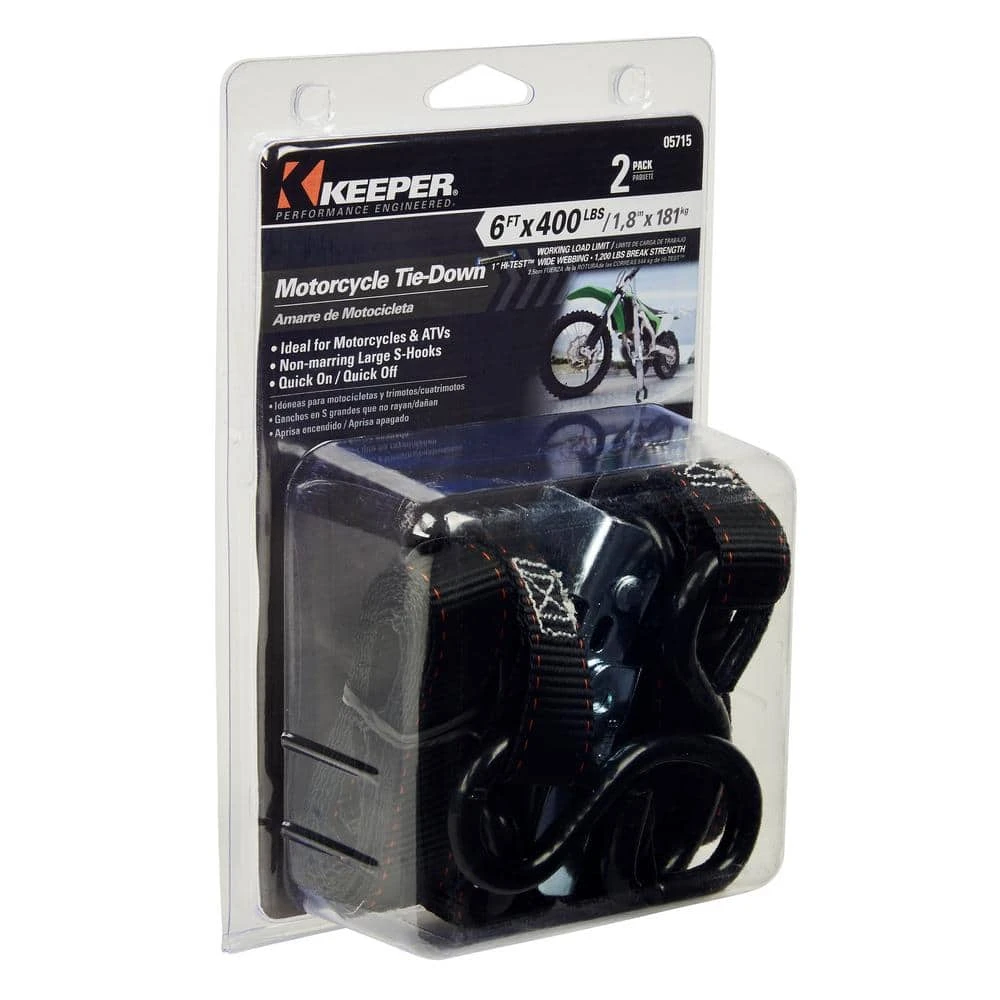 Keeper’s 1 in. x 6 ft. x 400 lbs. Motorcycle Cam Buckle Tie-down comes in a convenient 2-Pack. The cam buckle’s teeth grip the Hi-Test webbing and are engineered with a fast, easy to use quick release thumb button. A great addition to your motorcycle and ATV cargo control tied owns.