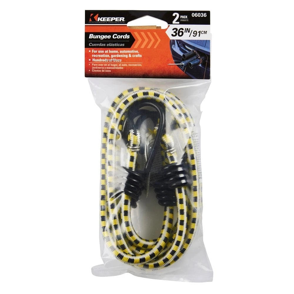 Keeper’s 36 in. Bungee Cord with Coated Hooks comes in a convenient 2 pack. Their quality design is dependable and won’t mar painted surfaces. Made from first quality rubber, it’s made to last. Durable outer jacket is woven in highly visible, attractive colors. Great for larger sized indoor and outdoor projects.
