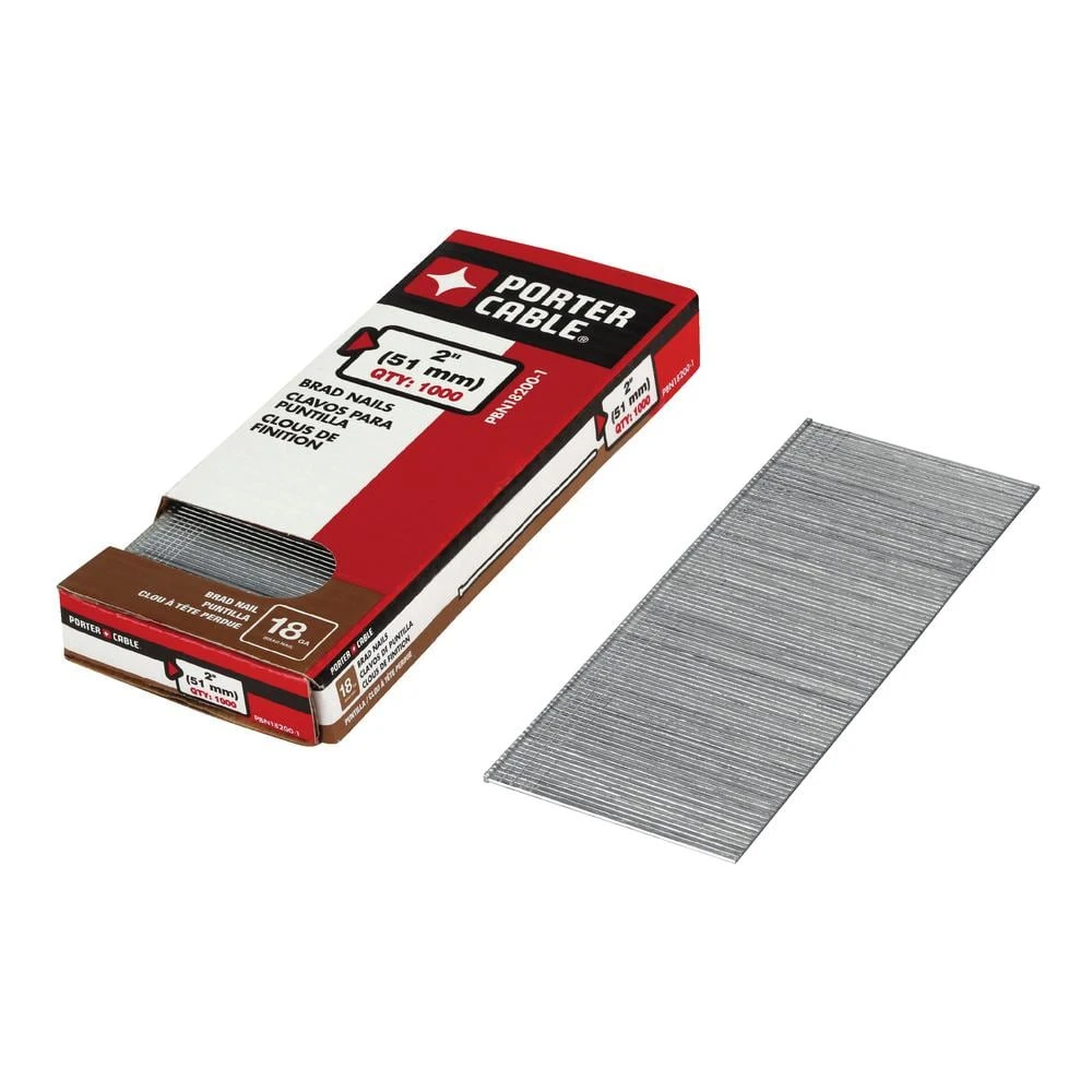 Porter-Cable 2 in. x 18-Gauge Glue 1M Steel Brad Nails are constructed from durable steel material and measure 2 in. long. These durable, glue-collated steel fasteners are built for indoor applications. Manufacturing a full line of power tools, equipment and accessories, Porter-Cable provides a product for every situation. From new home construction to building maintenance. From farms to upscale woodworking. Everyone from seasoned professionals to casual weekenders are putting Porter-Cable tools to work whenever they want the job done right.